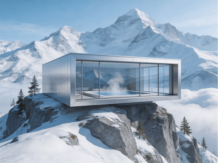 Suspended above alpine valleys with panoramic glazing and a private thermal spa suite.